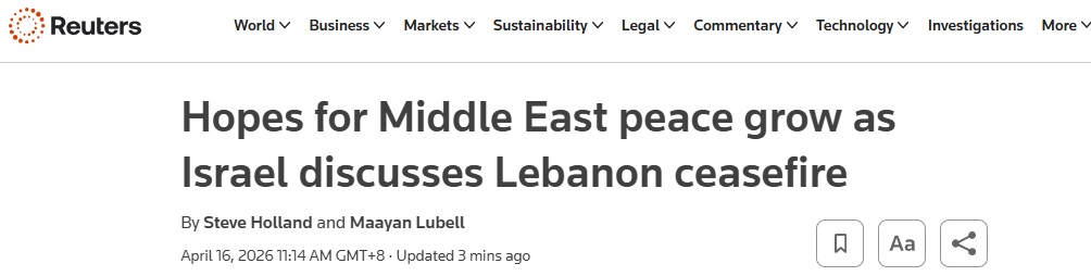 #伊朗危机追踪#FX168财经报社(亚太)讯 英国路透社周四(4月16日)最新报道称,周四,外界对中东战争可能接近尾声的乐观情绪升温。一位关键的巴基斯坦调解人正在德黑兰斡旋,而美国总统特朗普(Donald Trump)的政府也不断释放对达成协议的希望,该协议有望重新开放至关重要的霍尔木兹海峡。