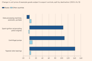 研究显示,从2021年到2024年,中国向俄罗斯出口受管制产品的平均价格上涨了87%。相比之下,类似商品出口到其他市场的价格仅上涨了9%。