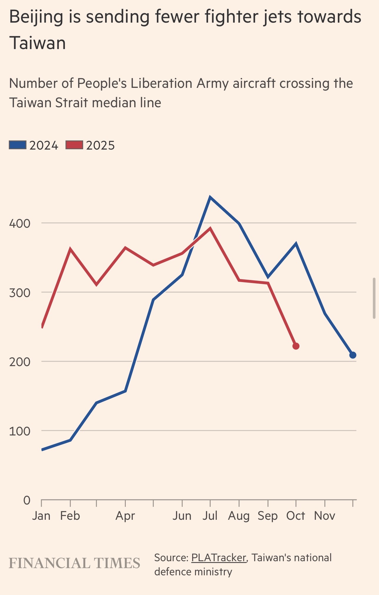 自5月以来,解放军战机穿越台湾海峡中线的次数大幅减少,相较去年同期明显下降。自7月以来,靠近台湾空域的解放军军机整体出动次数,也较2024年有所回落。