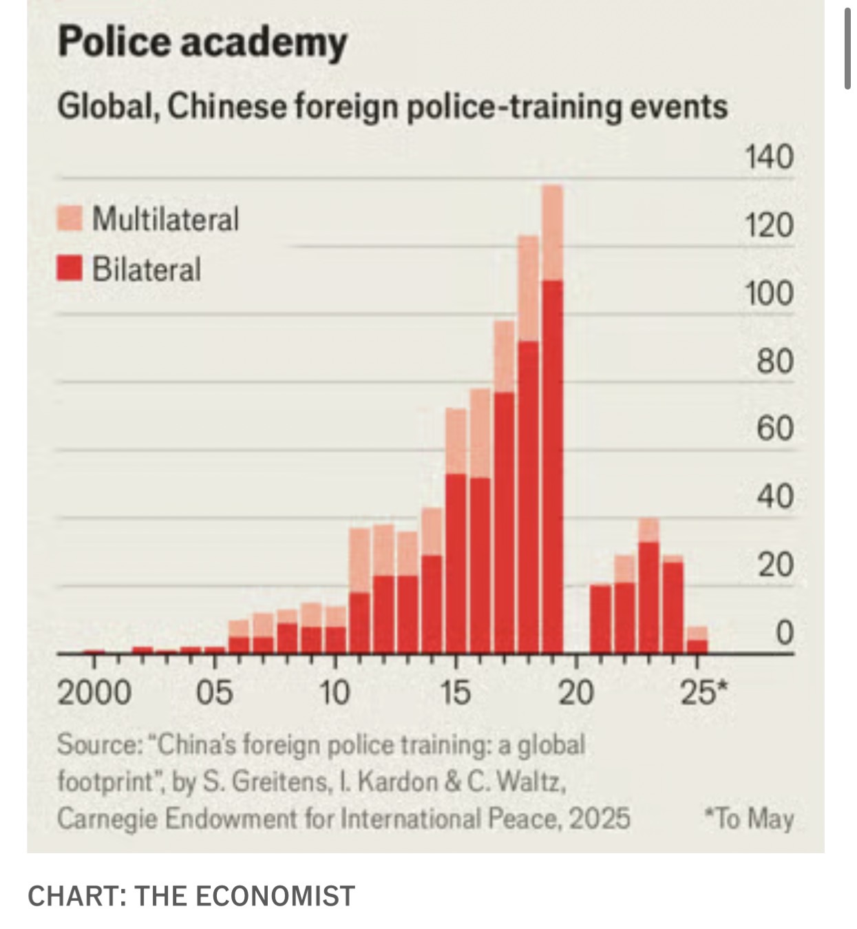 将卡内基的数据与经济学人智库的民主指数交叉比对后发现,全球82%的威权政权接受过中国的警察培训。