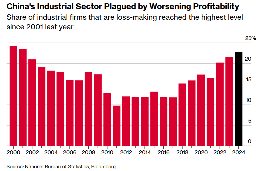 中国工业部门的盈利状况持续恶化,亏损企业占比在去年达到2001年以来的最高水平。