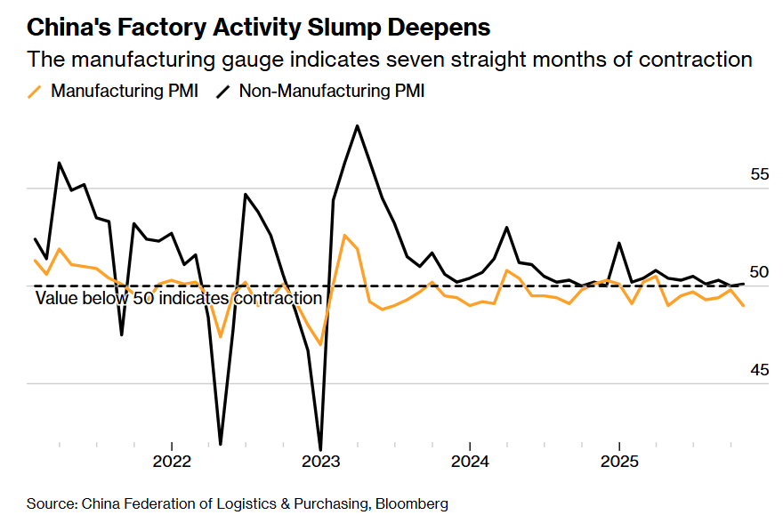 自4月以来,中国制造业活动一直处于收缩区间。当时美国总统唐纳德·特朗普发起的关税行动给中国工厂及全球需求带来了压力。