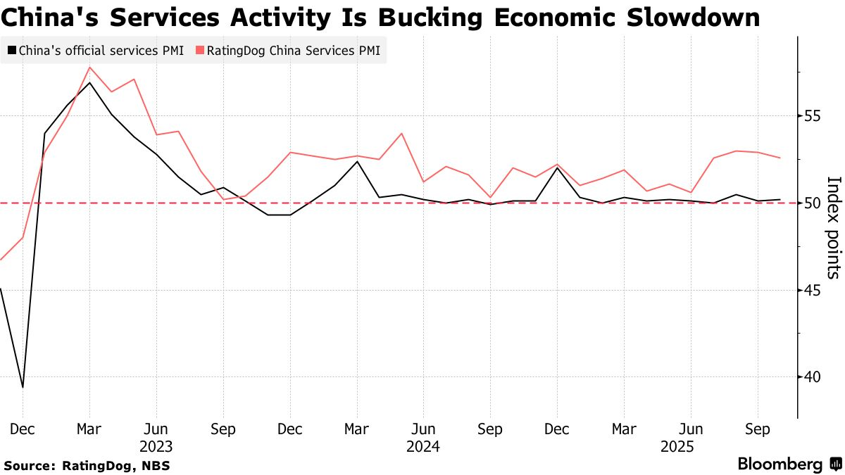 周三(11月5日)发布的一项私人调查显示,标普全球编制的RatingDog中国综合服务业采购经理人指数(PMI)从9月的52.9降至52.6,延续自2022年新冠封控结束以来的增长势头。彭博社调查的经济学家中值预期为52.5,任何高于50的读数都表示经济活动扩张。