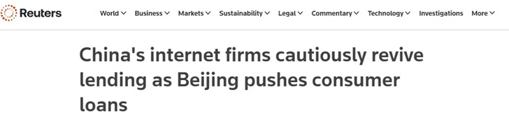 路透社报道称,互联网平台将此举以及此前中国领导人与知名民营企业高管的高级别会晤,解读为可谨慎扩展消费信贷业务的绿灯。