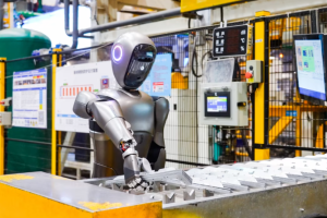 在荆州,协同工厂大脑运作的人形机器人将模具零件运送至检测站,3D相机完成质量检测。如果零件未通过,AI系统会判断并制定解决方案。
