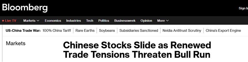 彭博社指出,两大经济体之间关系的持续恶化可能会危及中国股市,并再次引发人们对中国投资潜力的质疑。中国股市是今年全球表现最佳的股市之一。