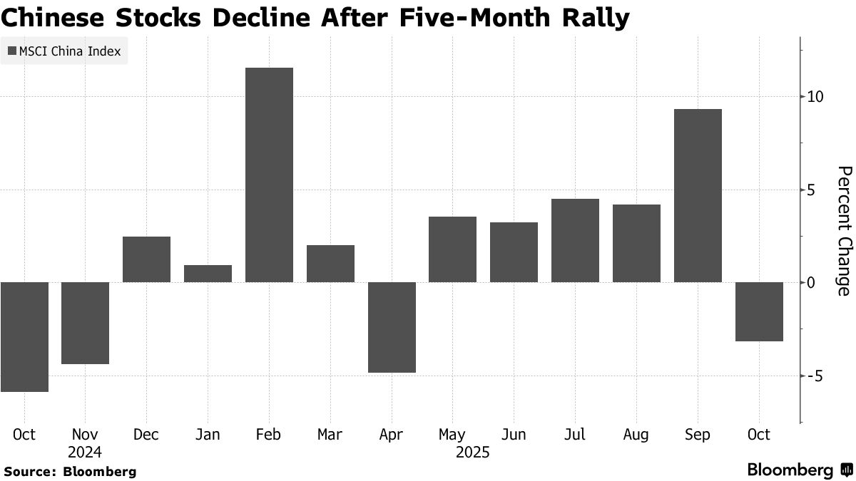 在经历了由人工智能热潮推动的连续上涨之后,MSCI中国指数有望录得六个月以来的首个下跌月。投资者目前正密切关注本月(10月20日至23日)召开的中共二十届四中全会,以及美国总统特朗普与中国国家主席习近平可能举行的会晤,以判断股市的未来走向。