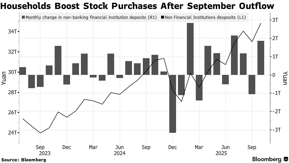 根据央行周四(11月13日)公布的数据,非银行金融机构存款——通常作为居民用于股票、基金和信托等投资交易账户中的资金代理指标——在上月增加 1.8万亿元(约合2,537亿美元),升至 34.9万亿元。而在此前的9月份,这一数据曾下降1.1万亿元。