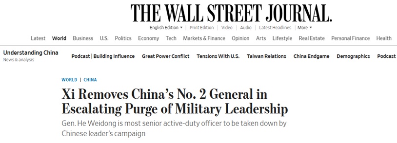 中国军方重磅!华尔街日报:习近平罢免“二号将领” 军队领导层清洗升级