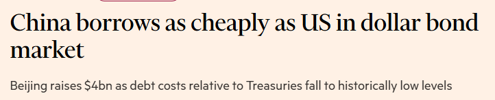 摘要:中国40亿美元美元债遭全球资金哄抢,认购飙近30倍,融资成本首次追平美国国债。