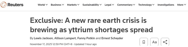 FX168财经报社(亚太)讯 英国路透社周一(11月17日)发布独家报道称,由于中国的出口限制,稀土元素钇的全球供应正日益短缺,这引发了对供应不足和成本激增的担忧,相关影响可能波及航空航天、能源以及半导体制造领域。