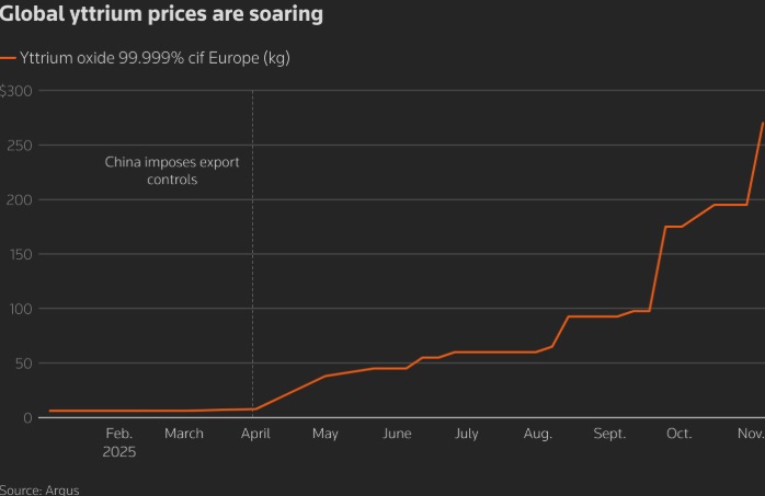 根据Argus的数据,用于制造耐热涂层的氧化钇在欧洲的价格自1月以来已上涨4,400%,达到每公斤270美元。数据显示,中国国内价格约为每公斤7美元,同期上涨16%,但正在回落。