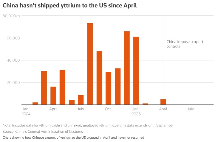 中国作为这种元素的主要来源国——该元素用于发动机中的特种合金以及耐高温涂层——在4月份与另外六种稀土一起限制了出口,以回应美国的关税措施。