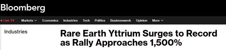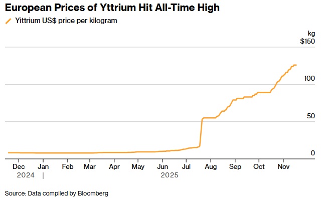 FX168财经报社(亚太)讯 美国彭博社周二(11月18日)报道称,稀土元素氧化钇今年暴涨近1500%后已创下历史新高,凸显中国实施贸易限制措施所带来的影响。