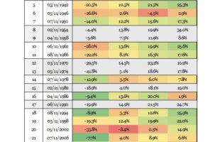 不过,正如表格所显示,这些现象仍然有意思。过去100年里出现了25次中期选举。其中有9次发生在经济衰退前后一年之内,这些在表中以灰色标出,科尔文已将它们排除在分析之外。