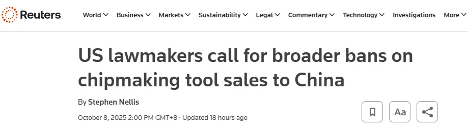 #中美关系#FX168财经报社(亚太)讯 英国路透社周三(10月8日)报道称,美国国会议员呼吁对向中国出口芯片制造设备实施更广泛的禁令,此前一项两党联合调查发现,中国芯片制造商去年购买了价值380亿美元的先进设备。