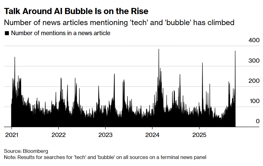 随着人工智能股票的激增,泡沫担忧也在升温。在美国银行10月的调查中,54%的投资者表示科技股的估值过高,对全球股市的担忧也达到了创纪录的水平。