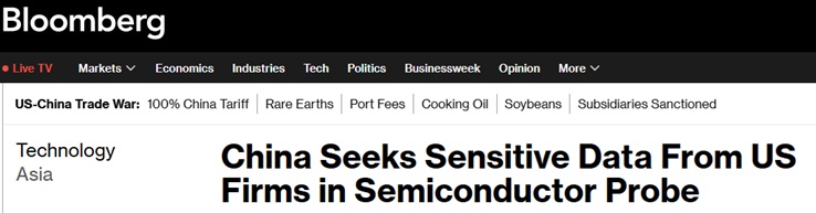 上个月,在全球两大经济体贸易谈判正在进行之际,中国对美国芯片制造商发起了两项调查。