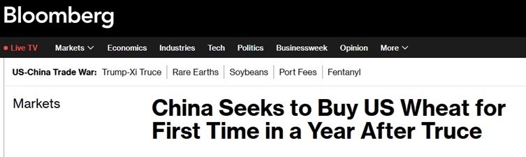 彭博社报道指出,北京方面重新表现出对美国小麦的兴趣,正值中国整体小麦进口量大幅下降。今年前九个月,中国小麦进口量较去年同期下降至不到三分之一。