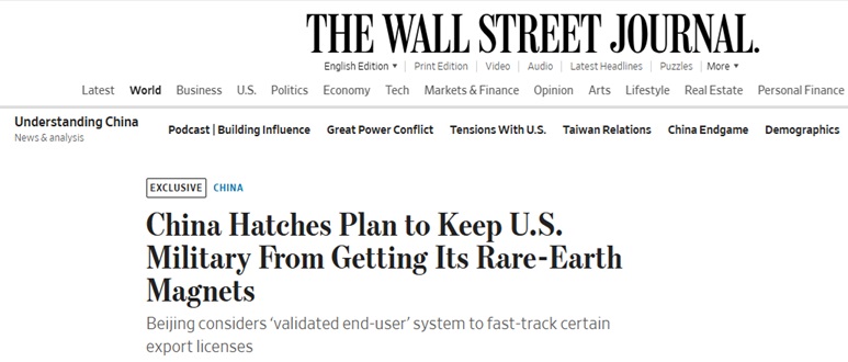 中美突传重磅!华尔街日报独家:中国酝酿计划 阻止美国军方获取其稀土磁铁