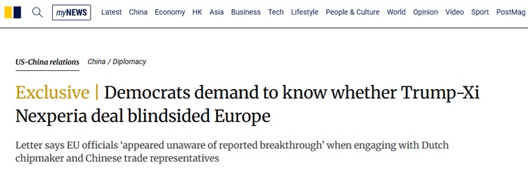 #中美关系#FX168财经报社(亚太)讯 香港《南华早报》周三(11月12日)发布独家报道称,美国国会的高级民主党成员要求弄清楚,美国总统特朗普(Donald Trump)是否就安世半导体(Nexperia)的未来与北京方面达成了一项协议,而这项协议让华盛顿的欧洲盟友措手不及。