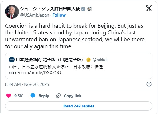 尽管华盛顿方面对东京与北京之间的紧张局势反应不多,但格拉斯已多次在社交媒体上批评中国及中国官员针对高市早苗上周关于台湾的言论所作出的回应。