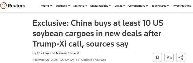 #中美关系#FX168财经报社(亚太)讯 英国路透社周三(11月26日)发布独家报道称,据两位了解交易情况的贸易商称,自周二以来,中国已签下至少10船美国大豆合同,价值约3亿美元;此前一天,中美领导人刚刚通电话。