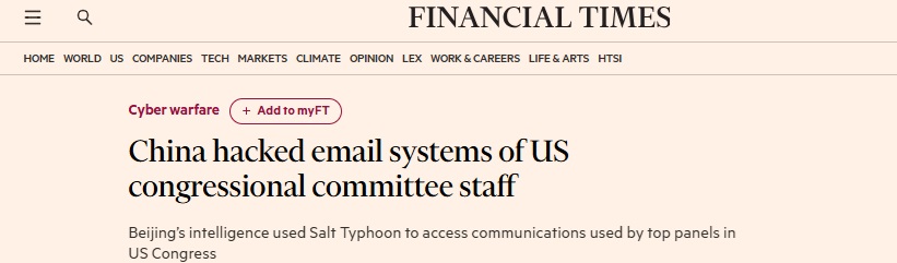 #中美关系#FX168财经报社(亚太)讯 英国《金融时报》周四(1月8日)最新发布独家报道称,作为一项被称为“盐台风”(Salt Typhoon)的大规模网络间谍行动的一部分,中国已入侵美国众议院多个具有重要影响力委员会工作人员所使用的电子邮件系统。