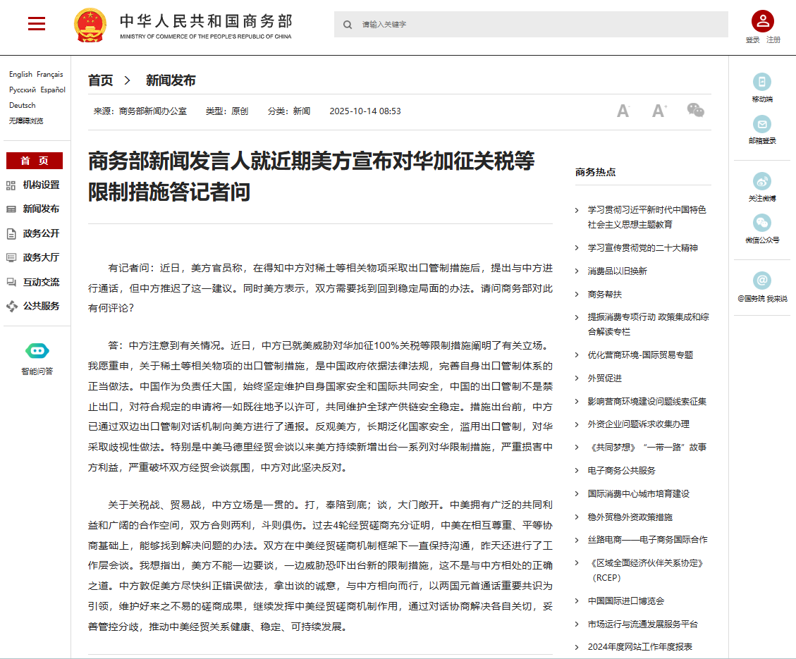 中国商务部还指出,已在上周正式提前告知美方稀土出口管制的安排,反驳了美方“未被通知”的说法。中方强调,此举出于国家安全与供应链稳定考量,并非单纯贸易手段。