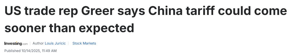 美国贸易代表贾米森·格里尔(Jamieson Greer)周二在接受 CNBC 采访时表示,总统唐纳德·特朗普可能最早于11月1日对中国商品征收100%关税,时间点“取决于中国的下一步动作”。