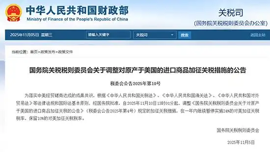 这项关税取消措施将于11月10日正式生效。就在数小时前,美国总统唐纳德·特朗普签署两项行政命令,正式将针对中国出口商品的芬太尼相关关税降至10%,并将美国对等关税税率从34%下调至10%。