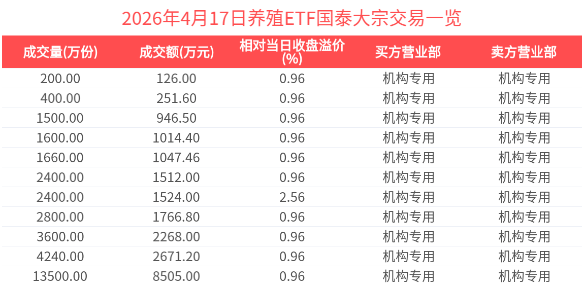 2026年4月17日,养殖ETF国泰(159865.SZ)收跌1.27%,发生11笔溢价大宗交易,成交价分别为0.6300元,0.6300元,0.6300元,0.6300元,0.6300元,0.6300元,0.6300元,0.6300元,0.6300元,0.6300元,0.6400元,较当日收盘价分别溢价0.96153846%,0.96153846%,0.96153846%,0.96153846%,0.96153846%,0.96153846%,0.96153846%,0.96153846%,0.96153846%,0.96153846%,2.56410256%,成交额分别为126.00万元,251.60万元,946.50万元,1014.40万元,1047.46万元,1512.00万元,1524.00万元,1766.80万元,2268.00万元,2671.20万元,8505.00万元,总成交额为2.16亿元,居全市场首位。(数据来源:Wind)