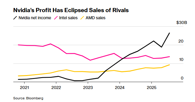 无论最新季度与预期相比表现如何,都标志着公司的惊人增长。销售额相比三年前同期将增长约十倍。英伟达今年的年度净利润预计将超过多年竞争对手英特尔和超微半导体的全年销售额。