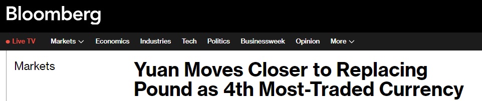 FX168财经报社(亚太)讯 美国彭博社周三(10月1日)报道称,国际清算银行(Bank for International Settlements)的数据显示,人民币的全球交易量已飙升至每天8170亿美元,延续了长达十年的增长趋势,交易规模已接近英镑的水平。