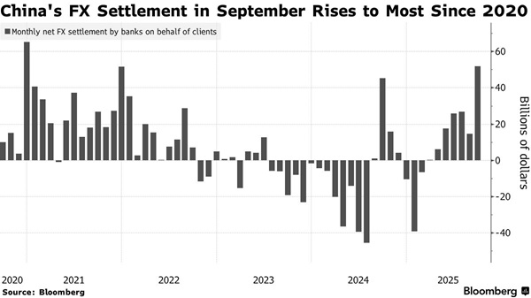 这些数据突显出,在9月份出口强劲增长的背景下,货物贸易的货币兑换量激增。这有助于抵消证券投资的流出,因为中国央行的另一份数据显示,上个月外国机构继续削减境内债券持有量。