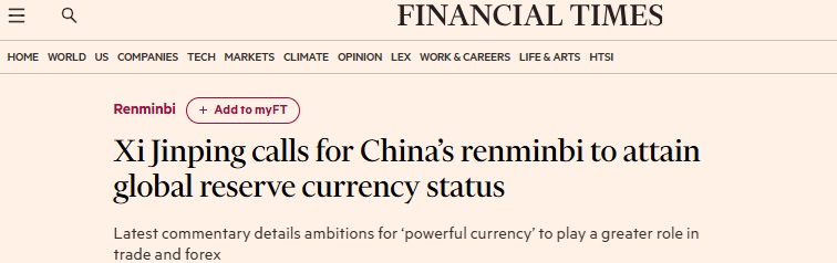 FX168财经报社(亚太)讯 英国《金融时报》周日(2月1日)报道称,中国国家主席习近平对其人民币雄心做出迄今最明确的表态,呼吁推动人民币成为一种全球储备货币。北京方面正寻求在国际货币体系中扮演更大角色。