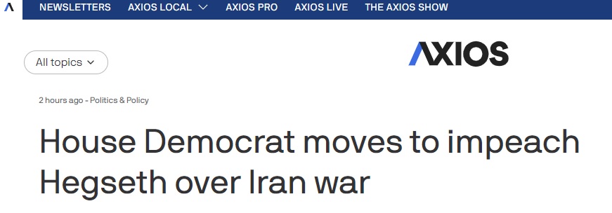 这位众议院民主党新生代议员团主席表示:“赫格塞斯对美国军人的鲁莽危害以及一再犯下的战争罪……构成了弹劾并将其免职的理由。”