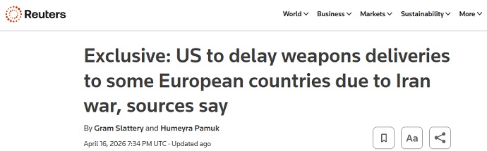 #伊朗危机追踪#FX168财经报社(亚太)讯 英国路透社周四(4月16日)发布独家报道称,五位知情人士透露,美国官员已告知部分欧洲方面,由于对伊朗战争持续消耗武器库存,部分此前已签约的武器交付可能会被推迟。