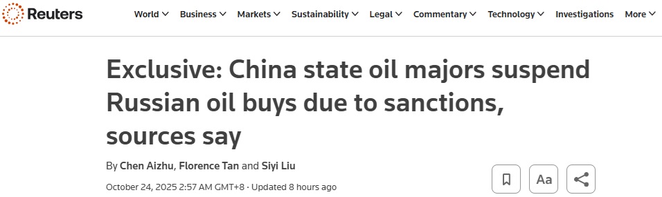 FX168财经报社(亚太)讯 英国路透社周五(10月24日)发布独家报道称,多位贸易消息人士周四表示,在美国对俄罗斯两大石油公司——俄罗斯石油公司(Rosneft)和卢克石油公司(Lukoil)实施制裁后,中国国有石油巨头已暂停购买俄罗斯海运石油。