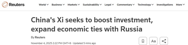 FX168财经报社(亚太)讯 英国路透社周二(11月4日)最新报道称,根据中国官方媒体,中国国家主席习近平周二寻求扩大与俄罗斯的相互投资,并重申北京致力于在“动荡”的外部环境下推进双边关系。