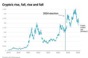 然而,加密货币的需求推动了价格上涨,并且多次在经历重大挫折后反弹。2022年,一系列破产和丑闻引发了一场“加密寒冬”,行业总市值被抹去三分之二。但价格随后企稳并缓慢回升,在去年秋季再次达到新高。