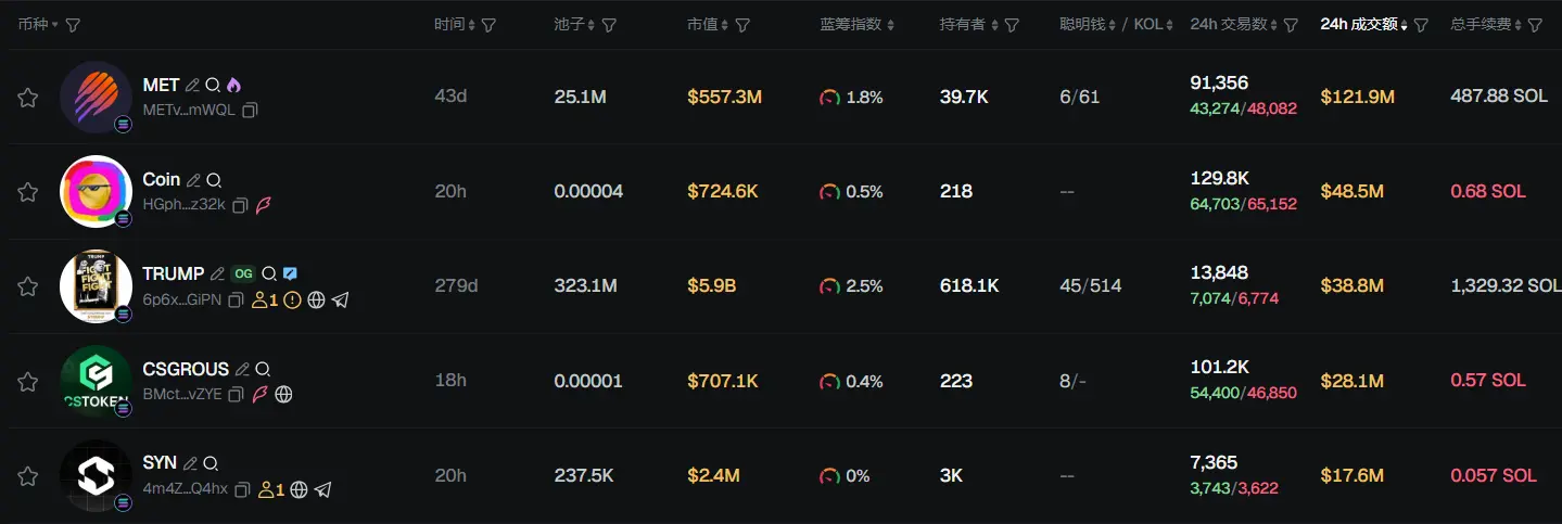过去 24h Solana 热门代币前五依次为:MET、Coin、TRUMP、CSGROUS、SYN