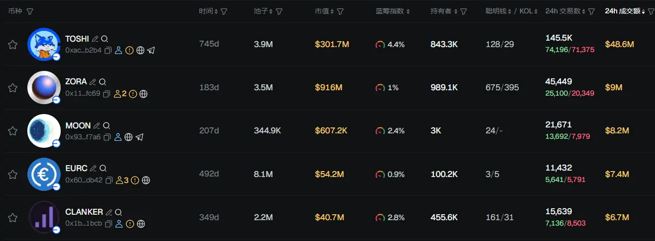 过去 24h Base 热门代币前五依次为:TOSHI、ZORA、MOON、EURC、CLANKER