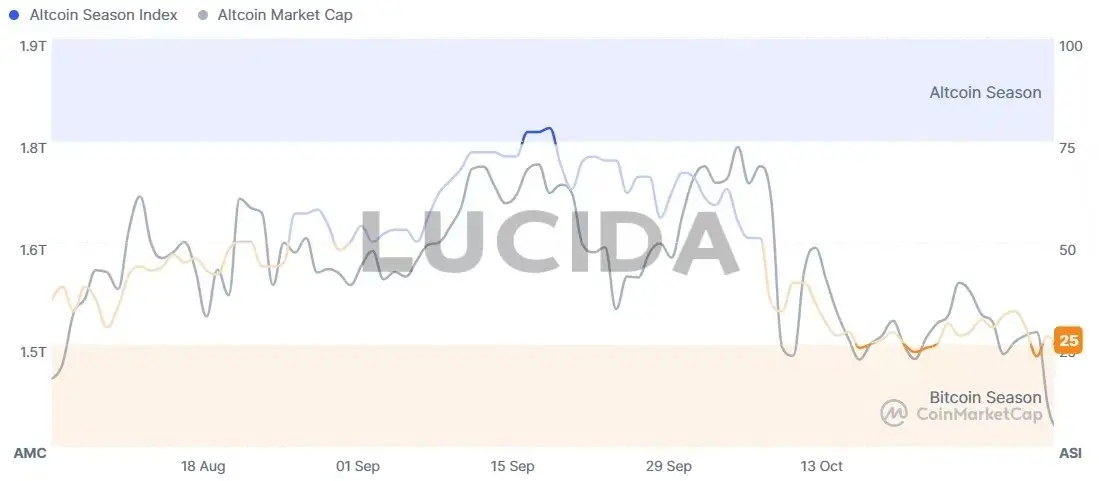 山寨季指数的核心逻辑在于衡量有多少主流山寨币在特定周期内表现优于比特币。当指数低于75,尤其是处于20-30的区间时(即“比特币季”),表明资金正从高风险的山寨币撤出,流向更稳健的比特币,这通常是市场避险时期或牛市初期的特征。这一点在10月底得到印证,当时该指数为32,确认了市场处于避险模式。