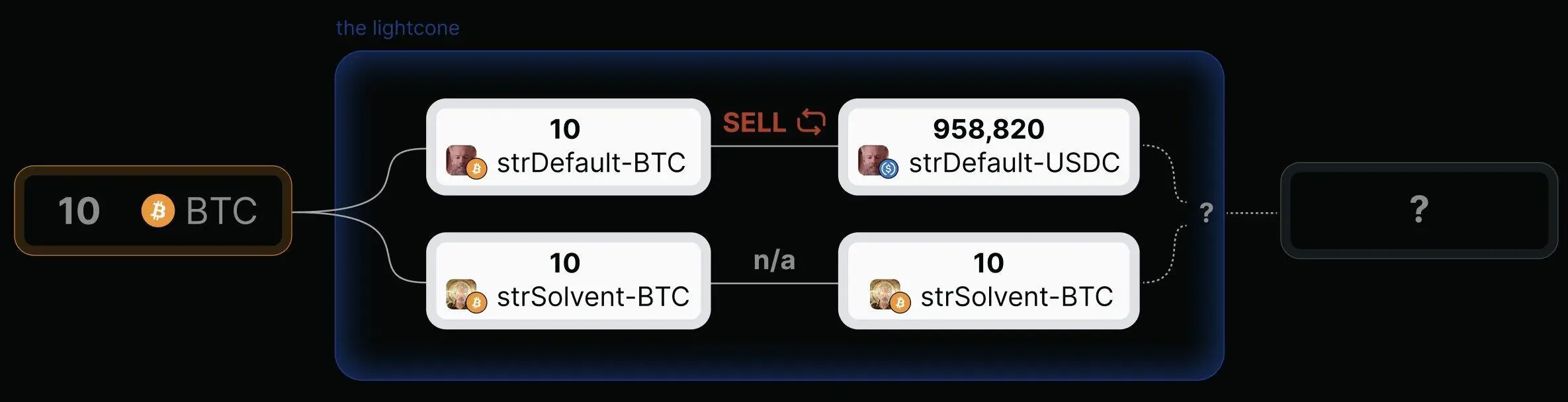 如果违约发生,他们的 strDefault-USDC 将变成真正的 USDC。他们成功地进行了对冲,并在事件发生之前卖出了比特币;如果没有违约发生,他们的 strSolvent-BTC 可以兑换成他们最初的比特币。他们仍然持有多头头寸,并且对冲操作没有产生任何成本。