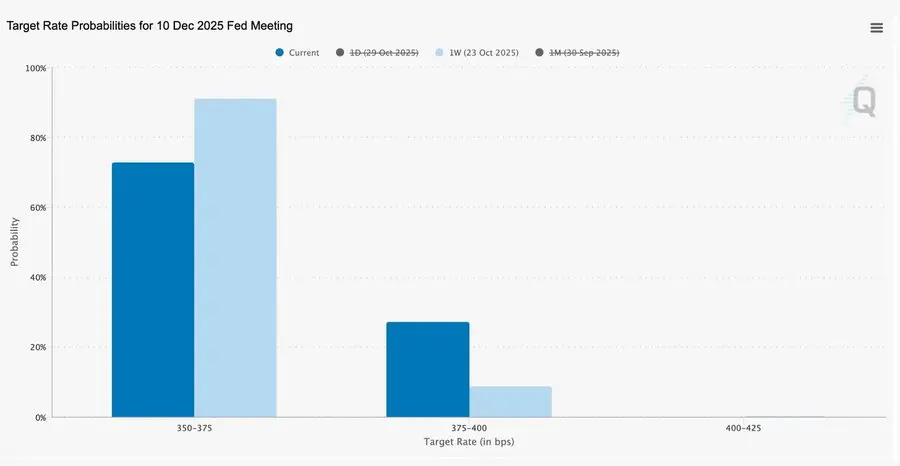 由于政府停摆引发的数据空白期,美联储几乎是在“盲开”。鲍威尔对交易员的暗示非常清楚:12 月能否公布利率尚无定论。降息预期迅速回落,短端利率曲线趋平,市场正在消化从“数据驱动”转向“数据缺失”的谨慎。