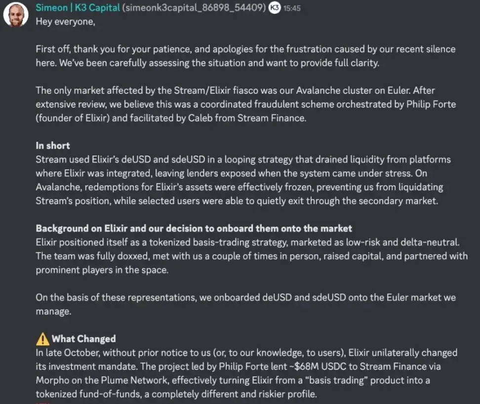 当 Stream 的坏账在 11 月 3 日公开后,K3 立刻联系 Elixir 的创始人 Philip Forte,要求保障能够 1:1 清算 deUSD。但 Philip 选择了沉默,完全不回应。在无奈之下,K3 只能在 11 月 4 日强行清算,手上留下了 200 万美元的 deUSD。Elixir 在 11 月 6 日宣布资不抵债,它的解决方案是散户和流动性池里的 deUSD 可以 1:1 兑换成 USDC,但 Curator 金库里的 deUSD 不给兑换,要求大家一起协商解决。