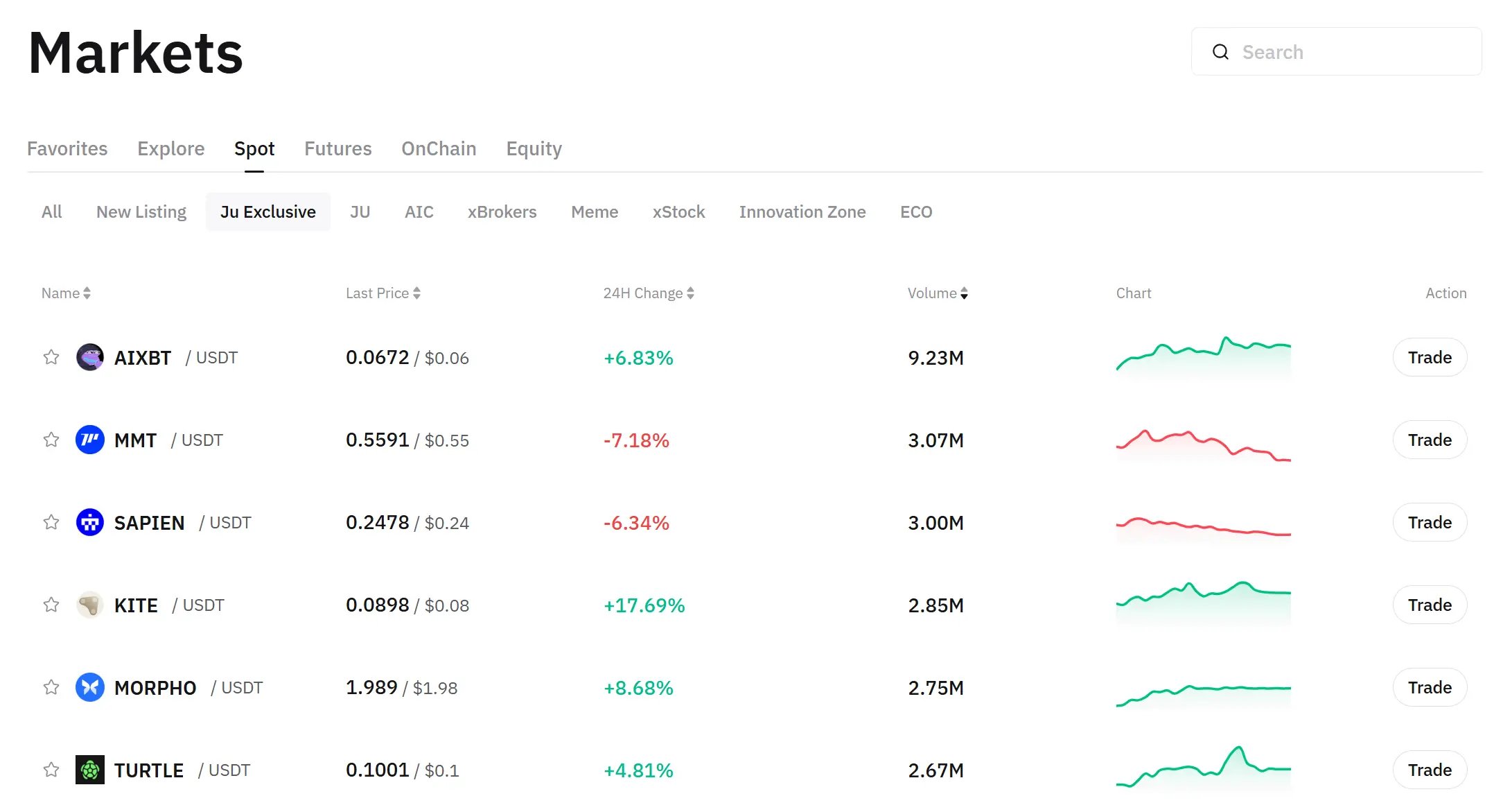 本周Ju.com研究院精选上线的优质代币呈现明显分化特征:MMT和UAI作为平台热门资产,日均交易量稳居榜首,成为投资者在市场波动期的首选标的。这两大代币不仅交易活跃度高,且价格走势相对稳定,为用户提供了可靠的交易机会。