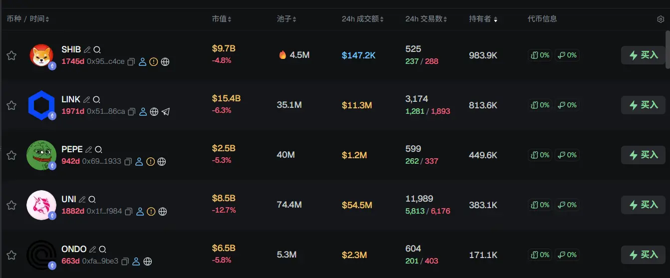 过去 24h ETH 热门代币前五依次为:SHIB、LINK、PEPE、UNI、ONDO
