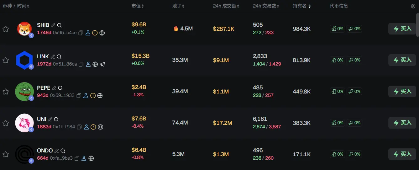 过去 24h ETH 热门代币前五依次为:SHIB、LINK、PEPE、UNI、ONDO